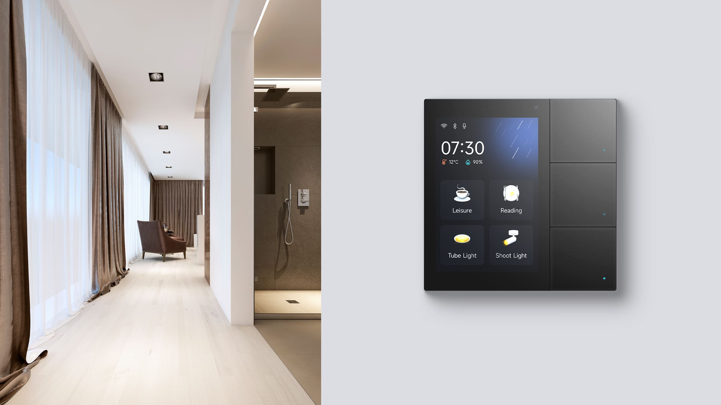 Das KNX Smart Touch S3 fügt sich nahtlos in jedes Interieur ein, mit einem 3,3-Zoll-Touchscreen und 3 physischen Tasten, die unterschiedliche Benutzerinteraktionen ermöglichen. Inspiriert durch den „Bildschirm-Tasten-Integration“-Designstil des Waltz Smart Touch+ Pad, vereint der KNX Smart Touch S3 virtuelle und physische Bedienelemente in einem Gerät. Die physischen Tasten sind nicht nur eine Hommage an bewährte Bediengewohnheiten, sondern bieten auch die Möglichkeit, Funktionen mit nur einem Tastendruck anzupassen – für eine noch einfachere Bedienung.
